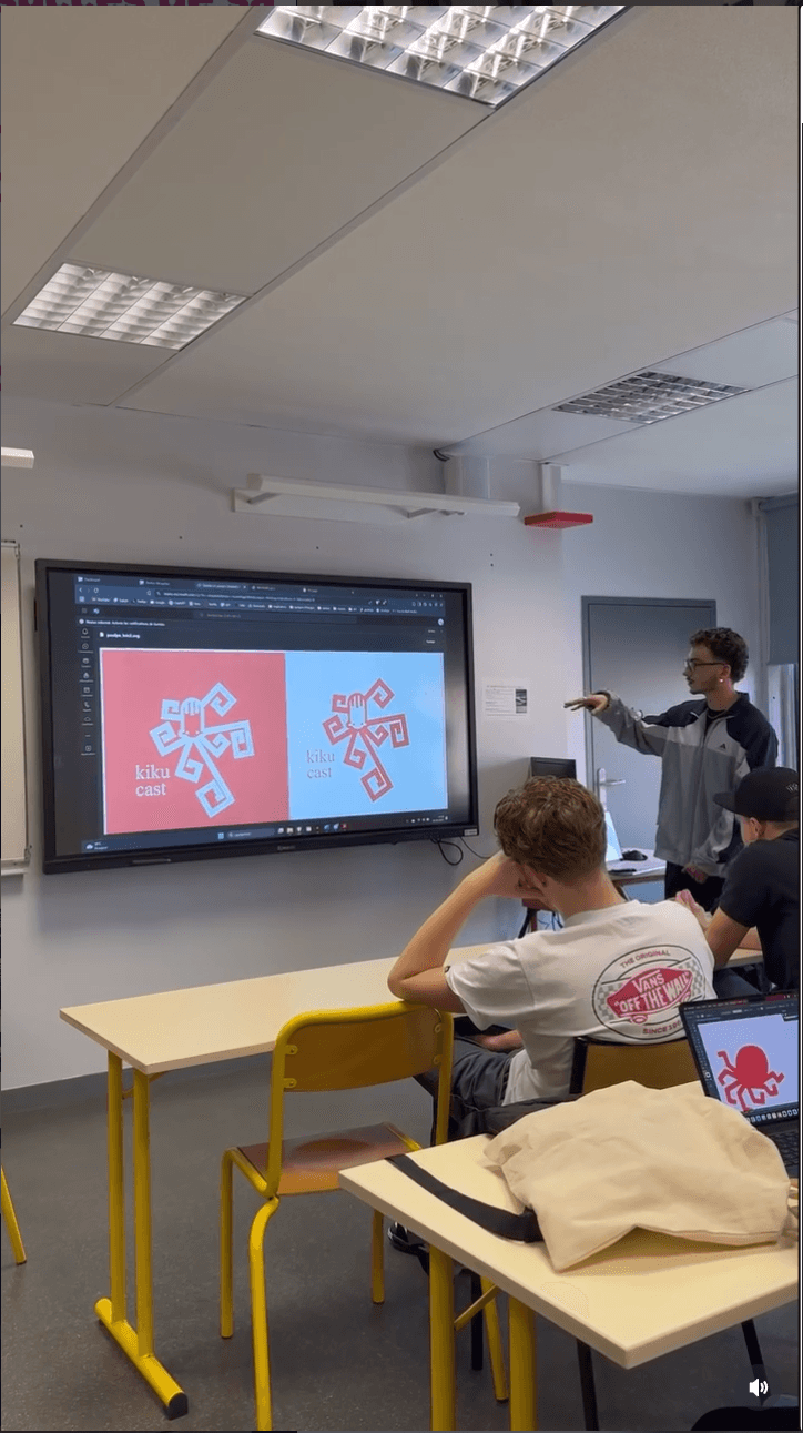 Le moment le plus révélateur du projet a été une crise en plein milieu de production : le logo retenu n'était pas compatible avec le nom "KikuCast". Arrêt de toutes les activités un mercredi matin, deux heures pour que chacun propose une nouvelle piste, réunion avec le professeur pour trancher. Le choix s'est porté sur le poulpe de Simon, en reprenant le style graphique du logo précédent et sa couleur orange. Charte corrigée, missions reprises, groupe relancé. C'est dans ce genre de moment qu'on comprend ce que diriger veut vraiment dire, pas gérer le flux normal, mais absorber l'imprévu sans que le reste s'effondre. Le projet a été présenté en fin de parcours devant la promotion entière, les professeurs et les représentants du musée Crozatier. Une mise en situation professionnelle réelle, jusqu'au bout.