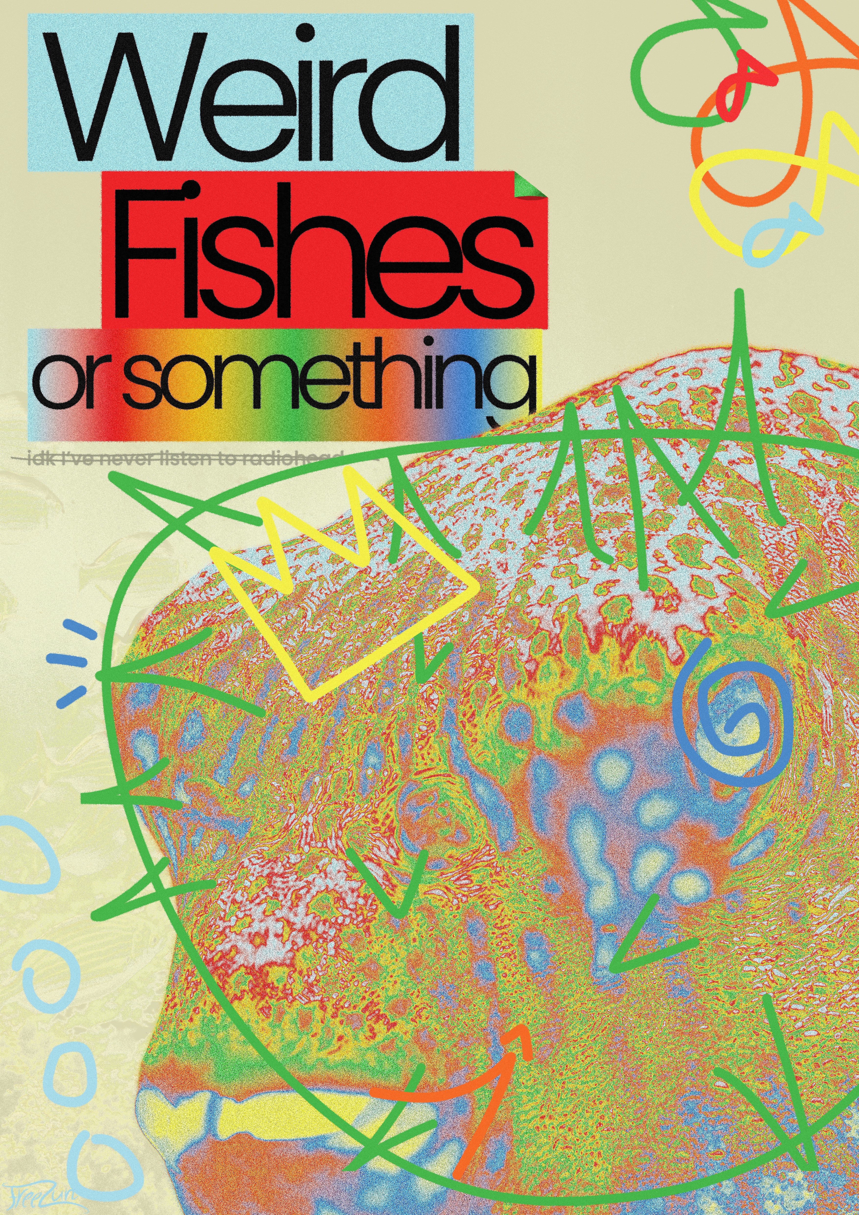 Affiches, covers d'album, identités visuelles, cette section regroupe un univers à part entière, celui où la couleur prend le dessus. Loin de l'épure blanche des motion designs, ces créations sont saturées, vibrantes, presque physiques. L'esthétique est réaliste dans le rendu, même quand le sujet ne l'est pas, un artiste qui marche sur un volcan en éruption, une scène impossible traitée avec le sérieux d'une photographie. C'est cette tension entre le crédible et l'impossible qui définit cet univers graphique. Réalisées sur Photoshop, Blender, Illustrator et parfois Adobe Aero, ces créations mêlent commandes, projets personnels et projets de cours suffisamment marquants pour finir sur Instagram, parce que la patte artistique était là et que l'outil ne fait pas la différence entre un brief scolaire et un vrai projet.